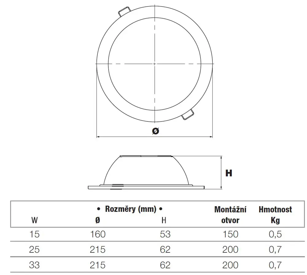 Vestavné svítidlo s radiálním zdrojem LED, jeho opálový difuzér zajišťuje rovnoměrné rozptýlení světla a eliminuje oslnění. Tělo vyrobeno z hliníku s bílým rámečkem.