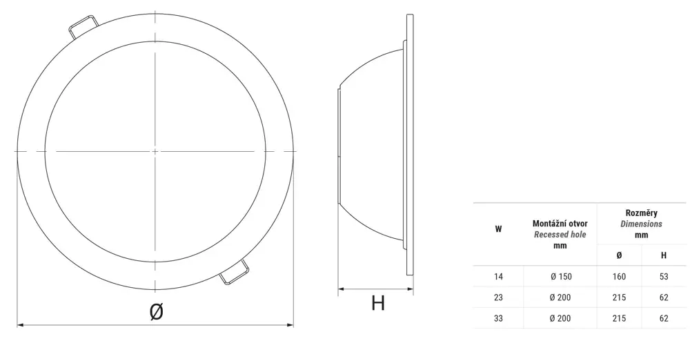 Vestavné svítidlo s radiálním zdrojem LED, jeho opálový difuzér zajišťuje rovnoměrné rozptýlení světla a eliminuje oslnění. Tělo vyrobeno z hliníku s bílým rámečkem.