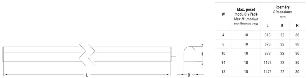K dispozici v pěti velikostech. Svítidlo je vybaveno příslušenstvím pro propojovací montáž. Propojovací montáž zajišťuje kontinuitu vyzařovaného světla bez oblastí stínu mezi jednotlivými moduly. Mechanicky dokonalé spojení s integrovanou průchodkou. Třípolohový přepínač na zadní straně svítidla umožňuje měnit teplotu chromatičnosti od 3000 do 5000k.