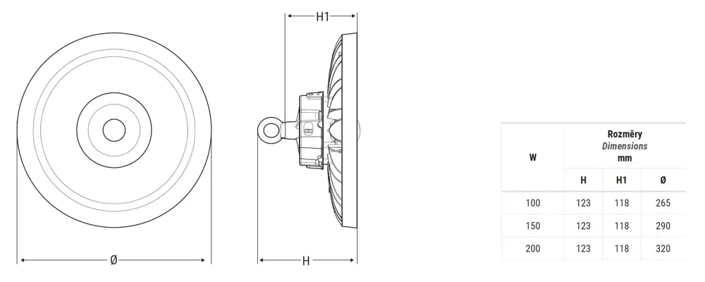 Těleso HighBay HE je vyrobeno z tlakově litého hliníku s rozptylnými žebry, která jsou integrována do horního krytu s předřadníkem. Difuzor 120° je vyroben z PMMA a senzor přítomnosti lze objednat samostatně k instalaci do středu optiky.