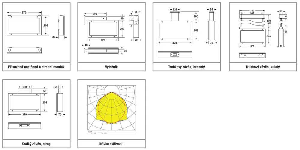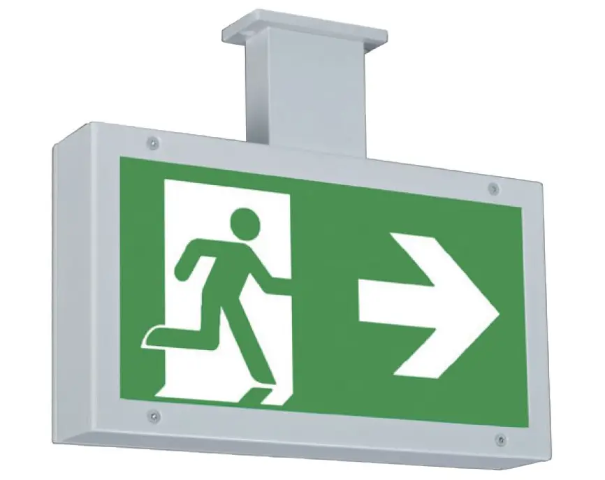 Svítidlo pro značení únikových cest: verze pro vestavnou nástěnnou montáž a s příslušenstvím pro montáž na výložník a závěs.