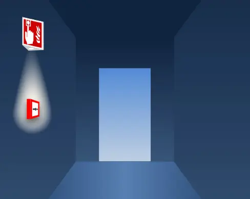 Dvojstranné značení požárně bezpečnostních zařízení je zajištěno vyměnitelnými piktogramy. Osvětlení požárně bezpečnostních zařízení s 5 lx pomocí vysoce výkonné LED diody se speciálními čočkami.
