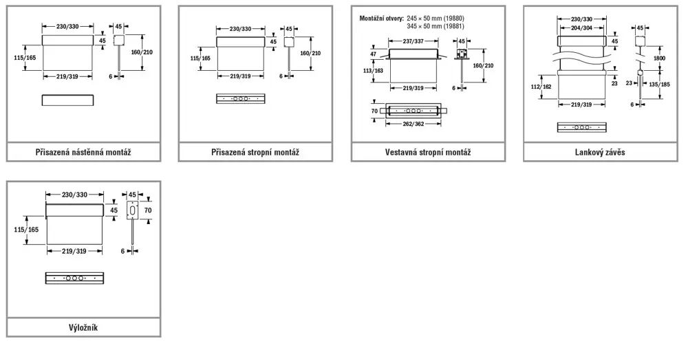Verze pro přisazenou nástěnnou a stropní montáž, montáž na výložník a lankový závěs. S příslušenstvím je možná vestavná stropní montáž.
