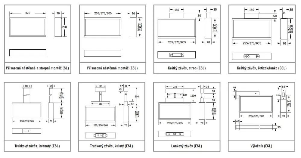 Svítidlo pro značení únikových cest: verze pro přisazenou montáž a s příslušenstvím pro trubkový závěs, lankovou, řetízkovou montáž a montáž na výložník.