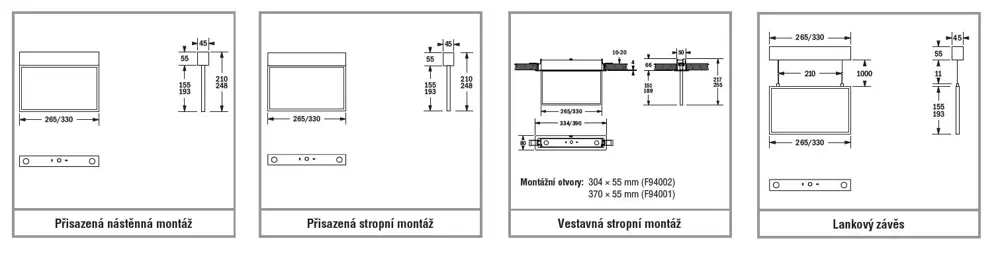 Verze pro přisazenou nástěnnou a stropní montáž, lankový závěs a s příslušenstvím i pro vestavnou stropní montáž.