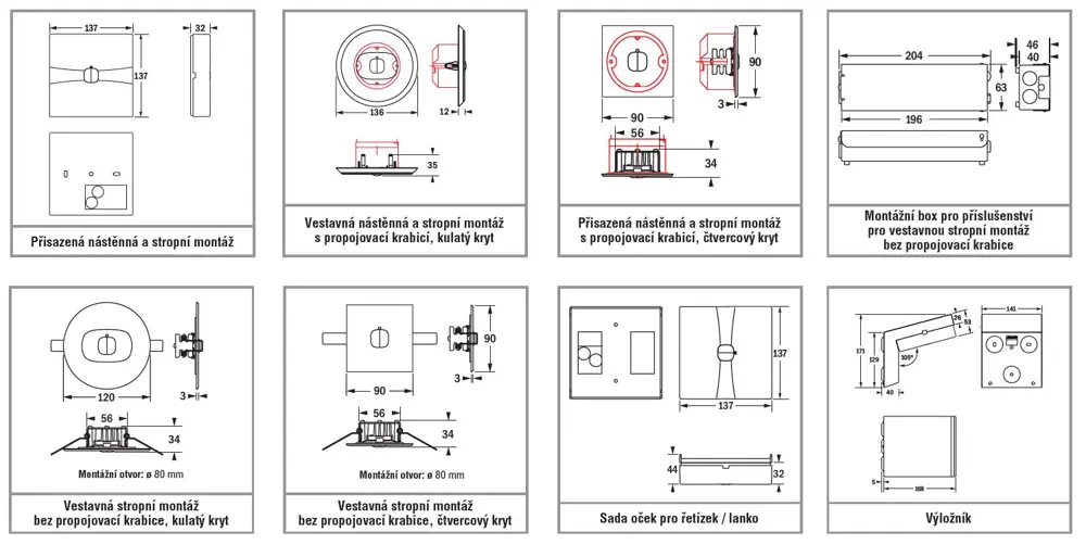 Verze pro přisazenou nástěnnou a stropní montáž, vestavnou nástěnnou (pouze verze S24 s montážním boxem) a stropní montáž a s dodatkovým příslušenstvím i pro montáž na výložník nebo řetízkovou / lankovou montáž (pouze verze pro přisazenou stropní montáž), verze S24 s montážním boxem také pro vestavnou montáž na protipožární stěny a stropy, kryty dostupné v jiných barvách na vyžádání.