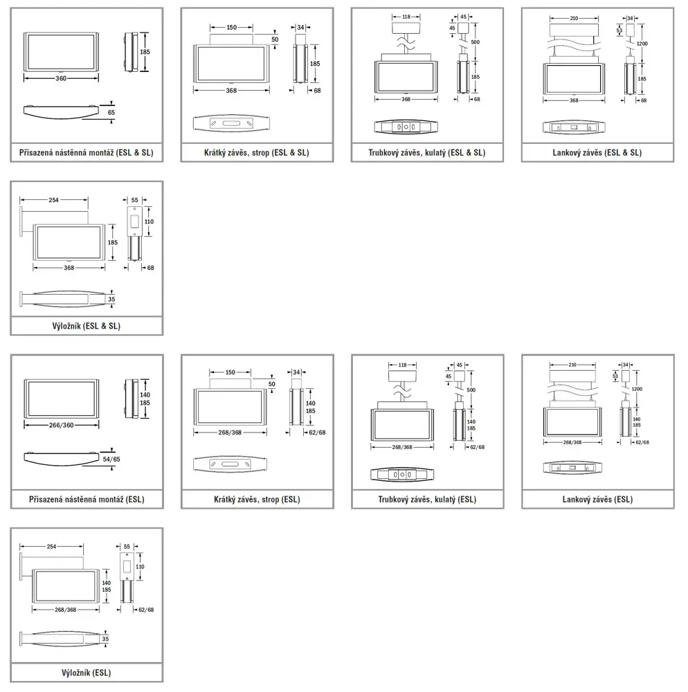 Dostupné jsou verze pro nástěnnou montáž nebo s příslušenstvím pro stropní montáž nebo lankový či trubkový závěs a verze pro vlajkovou montáž na výložník.