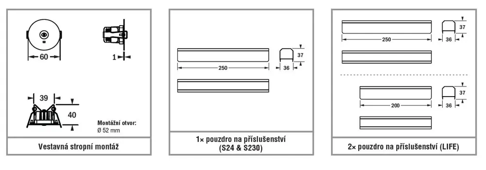 Downlight s tělesem a krytem z ocelového plechu. Vysoce výkonné LED se světlovodem skrze speciální čočky pro asymetrickou emisi světla (nasvětlení únikových cest – 1 lx) nebo symetrickou emisi světla (protipanické osvětlení – 0,5 lx). Tři optiky v jednom svítidle – díky třem dodávaným čočkám (1× asymetrická a 2× symetrická pro montáže do výšky až 3,5 m a 7 m).
