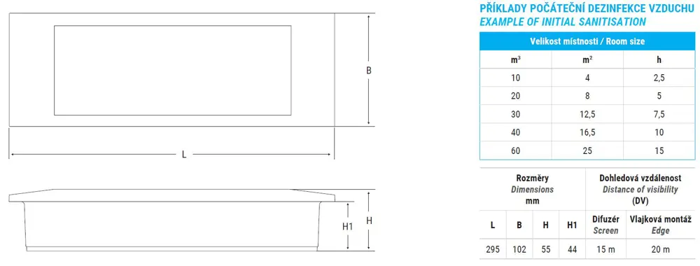 Nouzové svítidlo s vestavěnou UV-C čističkou vzduchu uvOxy®. Tři stupně aktivacečištění vzduchu: 8, 12, 24h denně, při konstantní rychlosti čištění.