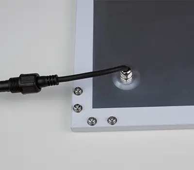 Gehäuse als Rahmen aus Aluminium mit integriertem Light-Guide-Panel aus opalem Kunststoff, mikroprismatisch. Homogene Lichtverteilung, tief-breitstrahlend. Extrem flaches Design in quadratischer Form. Lineares LED-Modul und elektronischer LED-Treiber als SmartDriver, dimmbar von 1% bis 100%, mit integrierten Ports für optionale Module zur dezentralen oder zentralen Dimmung, Steuerung und Überwachung.