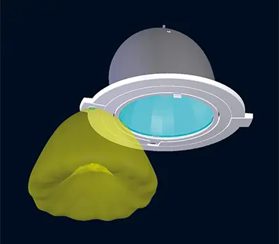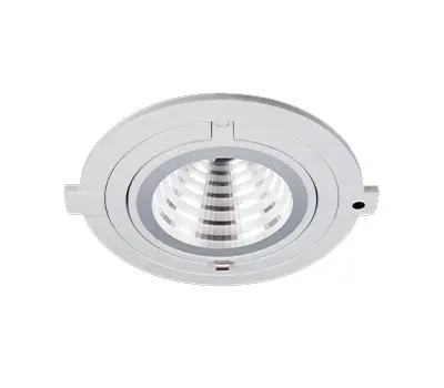 Gehäuse aus Aluminiumdruckguss mit runder Blende. Lichtlenkung durch integrierten Reflektor aus weißem Polycarbonat, um 345° dreh- und 60° schwenkbar, werksseitig breitstrahlend (70°). Wechselbare Reflektoren als Zubehör (16°, 24°, 40°). Separate Leuchten- und Betriebsgerätekomponente. Rundes LED-Leuchtmittel und elektronisches LED-Betriebsgerät als SmartDriver, dimmbar von 1% bis 100%, mit integrierten Interfaces für optionale Module zur dezentralen oder zentralen Dimmung, Steuerung und Überwachung.