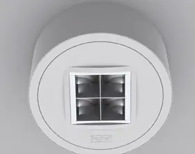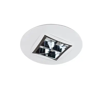Gehäuse aus Aluminium mit runder Blende und integrierter, quadratischer Lichtkammer. Lichtlenkung durch segmentierte, parabolisch geformte Reflektoren aus hochglänzendem Aluminium, tiefstrahlend. Separate Leuchten- und Betriebsgerätekomponenten. Rundes LED-Modul und elektronischer LED-Treiber als SmartDriver, dimmbar von 1% bis 100%, mit integrierten Interfaces für optionale Module zur dezentralen oder zentralen Dimmung, Steuerung und Überwachung.