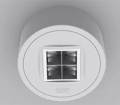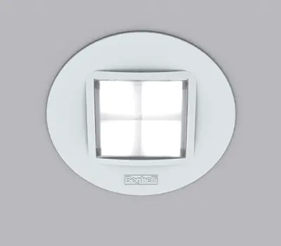 Gehäuse aus Aluminiumdruckguss mit runder Blende und integrierter, quadratischer Lichtkammer. Lichtlenkung durch parabolisch geformten Reflektor aus hochglänzendem Metallblech. Separate Leuchten- und Betriebsgerätekomponente. Rundes LED-Leuchtmittel und elektronisches LED-Betriebsgerät als SmartDriver, dimmbar von 1% bis 100%, mit integrierten Interfaces für optionale Module zur dezentralen oder zentralen Dimmung, Steuerung und Überwachung.