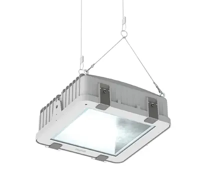 Gehäuse aus Aluminiumdruckguss mit eckiger Blende und zwei integrierten,quadratischen Lichtkammern. Lichtlenkung durch segmentierten, parabolisch geformten Reflektor (39°) aus hochglänzendem Aluminium, um 60° schwenkbar, breitstrahlend. Separate Leuchten- und Betriebsgerätekomponente. Eckiges LED-Leuchtmittel und elektronisches LED-Betriebsgerät als SmartDriver, dimmbar von 1% bis 100%, mit integrierten Interfaces für optionale Module zur dezentralen oder zentralen Dimmung, Steuerung und Überwachung.