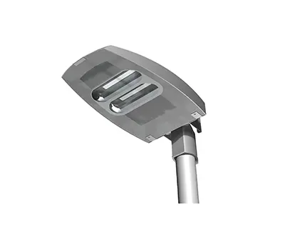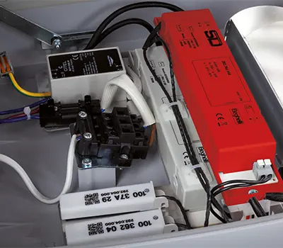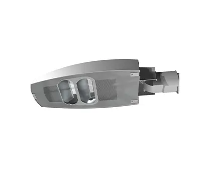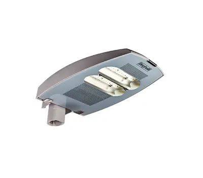 Gehäuse aus druckgegossenem Aluminium und Scheibe aus Hartglas. Gehäuseober- und Gehäuseunterteil mit Scharnieren verbunden und durch Edelstahl-Verschlüsse verschlossen. Lichtlenkung durch segmentierte Reflektoren, asymmetrisch breitstrahlend oder asymmetrisch extrem breitstrahlend für Strassen und asymmetrisch extrem breitstrahlend für Wege. Lineares LED-Leuchtmittel und elektronisches LED-Betriebsgerät als SmartDriver, dimmbar von 1% bis 100%, mit integrierten Ports für optionale Module zur dezentralen oder zentralen Dimmung, Steuerung und Überwachung.