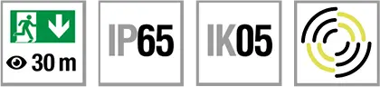 Rettungszeichenleuchte mit hoher Schutzart in eckigem Design. Sehr robustes Gehäuse aus unlackiertem Aluminium und universeller Displayscheibe aus Polycarbonat. Leicht zu installieren. 1- oder 2-seitige Rettungswegkennzeichnung durch wechselbare Rettungszeichenfolien. Großzügiger Anschlussraum für die interne Verdrahtung.