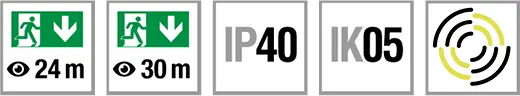 Rettungszeichenleuchte mit eckigem Gehäuse, Frame-Display und Light-Guide-Panel. 1- oder 2-seitige Rettungswegkennzeichnung durch wechselbare Rettungszeichenfolien.