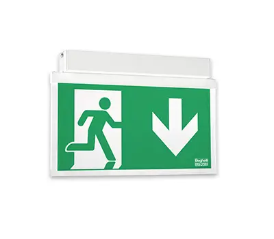 Gehäuse im Flat-Design aus Stahlblech und rahmenlosem Display mit integriertem Light-Guide-Panel aus klarem Kunststoff. Homogene Lichtverteilung zur Realisierung einer optimalen Beleuchtung des Rettungszeichens. 1- oder 2-seitige Rettungswegkennzeichnung durch wechselbare Rettungszeichenfolien.