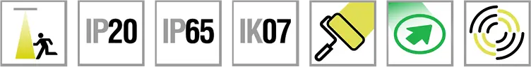 Downlight mit Gehäuse aus Stahlblech und Abdeckung in hoher Schutzart aus Polyhydroxyalkanoat (PHA), einem mit Wandfarbe überstreichbarem Biopolyester. Ein Paar High-Power-LEDs mit Lichtlenkung durch spezielle Linsen. Doppelte Optik in einer Leuchte - Durch eine einfache Drehung der High-Power-LEDs entweder asymmetrisch strahlende Lichtverteilung (Beleuchtung von Rettungswegen mit 1 lx) oder symmetrisch strahlende Lichtverteilung (Beleuchtung von Flächen mit 0,5 lx).