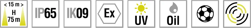 Hohe Schutzart und hohe Schlagfestigkeit. Gehäuse aus Aluminium-Druckguss in quadratischer Form. High-Power-LEDs mit Lichtlenkung durch spezielle Linsen für asymmetrische Lichtverteilung (Beleuchtung von Rettungswegen mit 1 lx) oder für symmetrische Lichtverteilung (Beleuchtung von Flächen mit 0,5 lx). Explosionsgeschützt für Zone 2 (II 3G Ex nA IIB T4 Gc) und Zone 22 (II 3D Ex tc IIIC T80°C Dc) mit Ausnahme des Zubehörs 15049. Extrem beständig gegen mechanische und chemische Beanspruchung. Alle Leuchten, mit Ausnahme des Zubehörs 15043, 15044 und 15049, sind für die Verwendung in Sportstätten geeignet (Zertifikat von akkreditierter Stelle verfügbar).