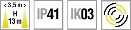 Kombinierte Allgemein- und Sicherheitsleuchte. Rundleuchte in Gehäuse aus Stahlblech mit gewölbtem Diffusor aus opalem Kunststoff. Homogene Lichtabstrahlung. Spezielle LED-Platine mit einem großen und einem kleinen LED-Kreis für unterschiedliche Funktionen bezüglich der Allgemein- und Sicherheitsbeleuchtung. Spezielle Versionen mit integriertem Bewegungsmelder verfügbar.