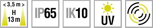 Kombinierte Allgemein- und Sicherheitsleuchte hoher Schutzart. Rundleuchte in Gehäuse als umlaufender Rahmen aus Kunststoff mit gewölbtem Diffusor aus opalem Kunststoff. Homogene Lichtabstrahlung. Spezielle LED-Platine mit einem großen und einem kleinen LED-Kreis für unterschiedliche Funktionen bezüglich der Allgemein- und Sicherheitsbeleuchtung. Spezielle Versionen mit integriertem Bewegungsmelder verfügbar.