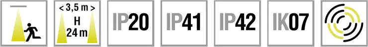 Gehäuse im Flat-Design aus Stahlblech und Abdeckung aus Polycarbonat. High-Power-LED mit Lichtlenkung durch spezielle Linsen für asymmetrisch strahlende Lichtverteilung (Beleuchtung von Rettungswegen mit 1 lx), symmetrisch strahlende Lichtverteilung (Beleuchtung von Flächen mit 0,5 lx) und 1-seitig asymmetrisch strahlende Lichtverteilung (Beleuchtung von Sicherheitseinrichtungen mit 5 lx). Quadratische Abdeckungen für Deckeneinbau als Zubehör separat bestellbar.