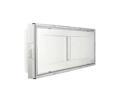 Rettungszeichen- und Sicherheitsleuchte mit Gehäuse und Abdeckung aus Polycarbonat (PC). Hohe Schutzart (IP65) und hohe Schlagfestigkeit (IK08). Zahlreiche Kabeleinführungen. Das RTI-System bietet eine sehr homogene Ausleuchtung der Rettungszeichenfolien sowie eine blendfreie Lichtverteilung bei der Verwendung als Sicherheitsleuchte. Mit der speziellen LED-Technik (für Montagehöhen von 2 m bis über 12 m, Leuchtenabstände bei Rettungswegen von bis zu 34 m) können sowohl Rettungswege, als auch Flächen sehr effizient beleuchtet werden.
