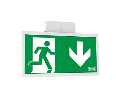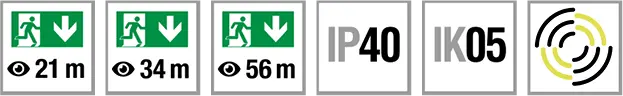Gehäuse aus flachen Stahlblech-Profilen mit eckigen Konturen. Verfügbar als Rettungszeichenleuchte oder Sicherheitsleuchte. High-Power-LED mit Lichtlenkung durch spezielle Linsen für asymmetrische Lichtverteilung (Beleuchtung von Rettungswegen mit 1 lx) oder symmetrische Lichtverteilung (Beleuchtung von Flächen mit 0,5 lx) bei Sicherheitsleuchte. 1- oder 2-seitige Rettungswegkennzeichnung durch wechselbare Scheiben mit zusätzlichem Lichtaustritt nach unten für Wandanbau bei Rettungszeichenleuchte.