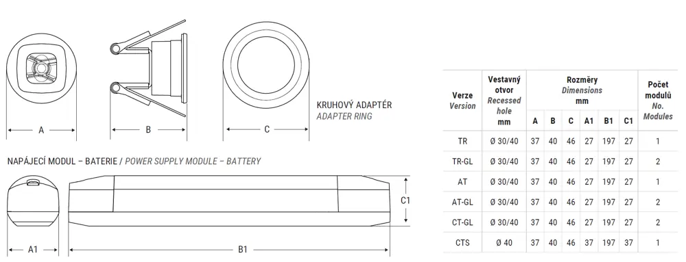 Installation: Recessed, ceiling, with ceiling rod, suspended and with double output in the power supply/battery module to power an additional LED strip with the spotlight.