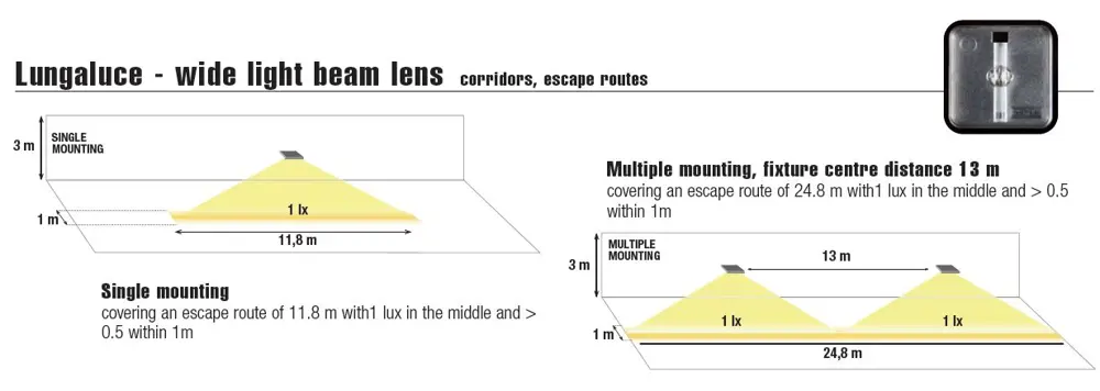 A single luminaire for escape routes up to 12m and for panic areas up to 90sqm. Adjustable autonomy from 1 to 8 hrs.