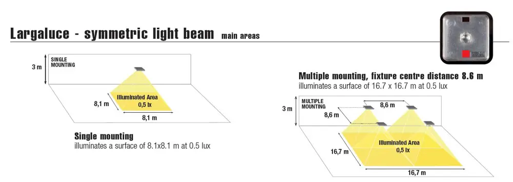 Three interchangeable lenses supplied for mounting from 3 to 7m high, with different light beams.