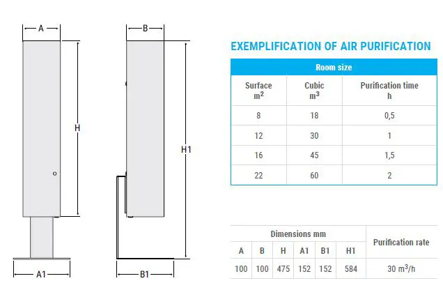 Air purification device. The filtration and purification unit consists of an axial fan intake system that draws air inside of the closed chamber containing the UV-C source, where the sanitization process takes place. The UvOxy® cartridge with a service life of 12* months is installed inside the unit. Cartridge replacement is fast and effective and ensures the maintenance of the purification properties of the appliance over time.