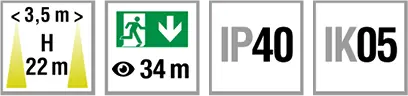 Combined escape sign and safety luminaire. Housing made of flat sheet steel profiles and angular contours. 1 or 2-sided escape route indication through exchangeable panes. Additional high-power LED with light guidance through special lenses for asymmetrical light distribution (illumination of escape routes with 1 lx) or for symmetrical light distribution (illumination of areas with 0.5 lx).