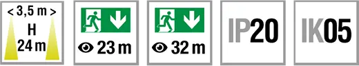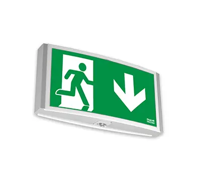 Combined escape sign and safety luminaire or escape sign luminaire. Housing in flat design with convex light outlet area and opal pane. 1- or 2-sided escape route indication through self-adhesive foils. Additional high-power LED with light guidance through special lenses for asymmetrical light distribution (illumination of escape routes with 1 lx) or for symmetrical light distribution (illumination of areas with 0.5 lx) for combined escape sign and safety luminaire.