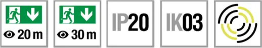 Housing in flat design made of sheet steel and frameless display with integrated light guide panel made of clear plastic. Homogeneous light distribution for realization of an optimal illumination of the escape sign. 1- or 2-sided escape route indication through exchangeable escape sign foils.