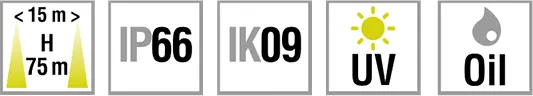 High type of protection and high impact resistance. Housing made of sheet steel with caps made of diecast aluminium. High-power LEDs with light guidance through special lenses for asymmetrical shining light distribution with extreme large luminaire distances of > 100 m at heights of 2.5 to 20 m, f. i. in tunnels or halls (illumination of escape routes with 1 lx). Extremely resistant against mechanical and chemical stress.