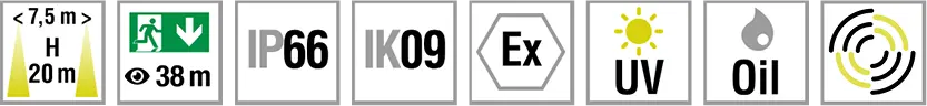High type of protection and high impact resistance. Housing made of galvanised sheet steel, caps made of plastic, pane made of tempered glass. Caps and pane tightly coupled with the housing. Light guidance through high-high-specular aluminium reflector. 1 or 2-sided escape route indication through exchangeable display panes. Explosion-protected for zone 2 (II 3G Ex nA IIB T4) and Zone 22 (II 3D Ex tD A22 T100). Extremely resistant against mechanical and chemical stress.