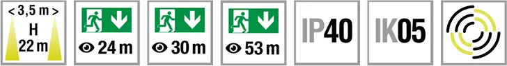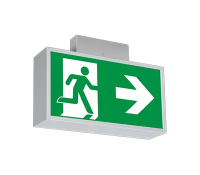 Housing made of flat aluminium profiles with angular contours. Available as escape sign luminaire or safety luminaire. High-power LED with light guidance through special lenses for asymmetrical light distribution (illumination of escape routes with 1 lx) or for symmetrical light distribution (illumination of areas with 0.5 lx) for safety luminaire. 1 or 2-sided escape route indication through exchangeable panes with additional light outlet downwards for surface wall mounting for escape sign luminaire.