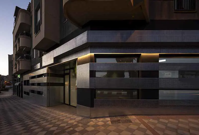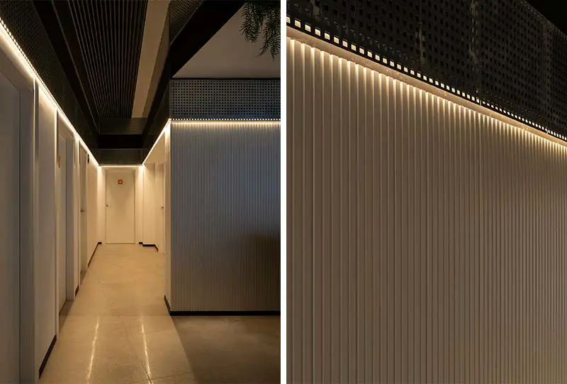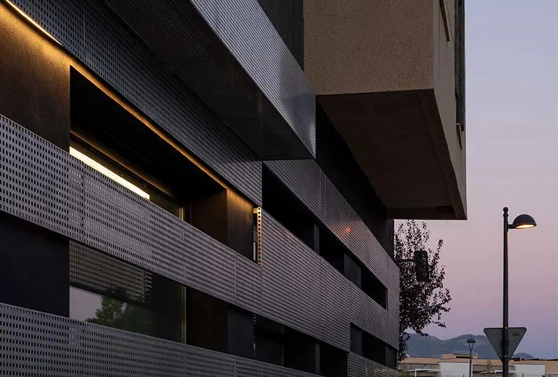 Beghelli LED strips filter light through the micro-perforated steel facade. This play of light creates a uniform, sifted scene that makes the Lumen Academy's metallic skin shine.