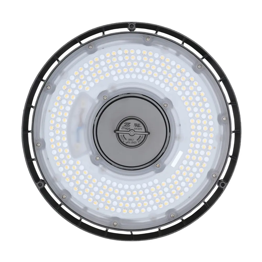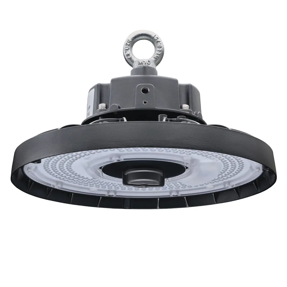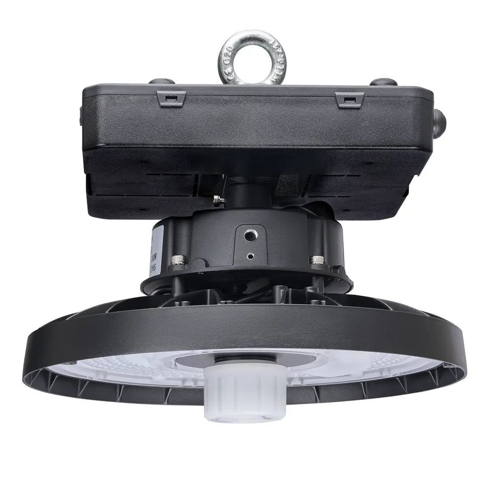 HighBay HE is a high-performance luminaire. The high luminous flux allows for very high lighting performance suitable for replacing conventional Highbay fixtures with metal halide sources in high ceiling height applications. The body of HighBay HE is made of die-cast aluminum with dissipating fins that integrate into the upper canopy that houses the driver. The 120° diffuser is made of PMMA, and a presence sensor can be ordered separately to be installed in the center of the optic.