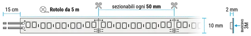 Professional self-adhesive flexible LED strips with very high LED density and excellent light output. Their CCT technology allows the user a wide choice of color tones, from warm to cool light, easily adjustable with supplied remote control. Supplied in 5-meter rolls already pre-wired, in IP20 or IP65 versions.
