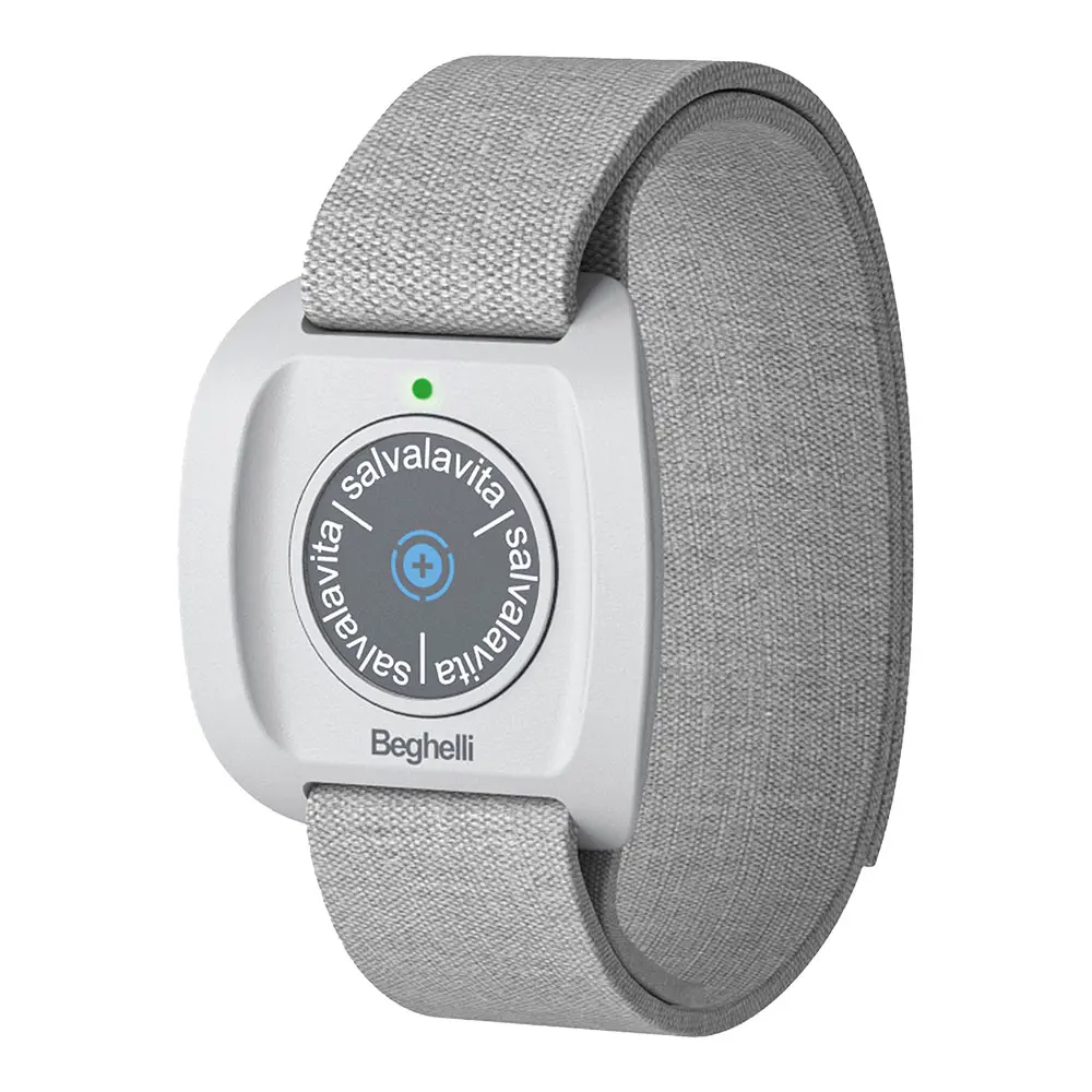 When the Salvalavita button is pressed for a long time, the bracelet connects to the Beghelli telephone which will call and send SMS to all the SOS numbers previously entered by the user. Salvalavita Band Plus is water resistant and can be worn all day during normal daily activities. The strap can be removed and the device can be used with the supplied multi-purpose strap.