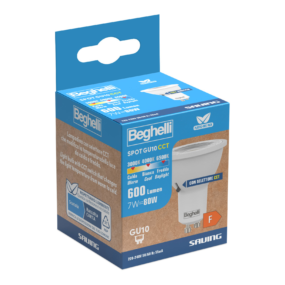 La lampadina Saving Spot CCT รจ dotata, sul lato del corpo, di selettore che consente di modificare la temperatura della luce tra calda, bianca o fredda.