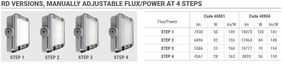 A Regolabile Driverrel (RD) szerelt változat sokoldalú megoldást jelent. A tápegység egy 4 állású kapcsolóval van ellátva, mely lehetővé teszi a fényáram 4 különböző értékre való beállítását.