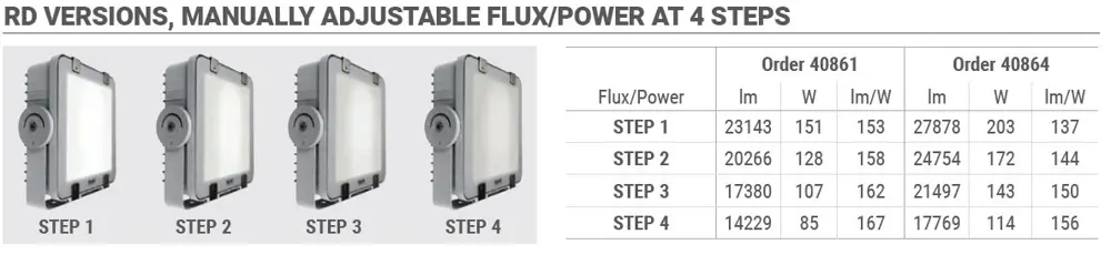 A Regolabile Driverrel (RD) szerelt változat sokoldalú megoldást jelent. A tápegység egy 4 állású kapcsolóval van ellátva, mely lehetővé teszi a fényáram 4 különböző értékre való beállítását.