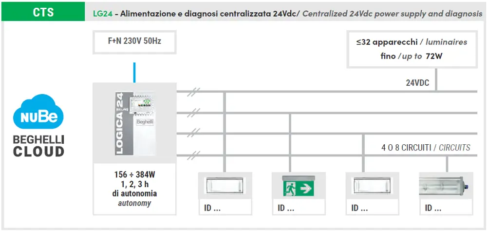 A Logica 24 központi akkumulátoros rendszer, amely kisfeszültséggel működő vészvilágító és kijáratjelző lámpák kezelését teszi lehetővé. A rendszer különböző diagnosztikai funkciókat kínál, köztük az automatikus akkumulátor ellenőrzést. A DIN EN 50172 szabványnak megfelelően a rendszer III. érintésvédelmi osztályba tartozik.