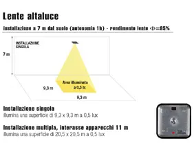 Nagy teljesítményű beépített vészvilágítási lámpa többfunkciós optikával. A különböző lencsék segítségével megváltoztathatjuk a megvilágított terület alakját és méretét, egyedüli eszköz, amely 12 m menekülési útvonalat vagy 90 m² területet képes megvilágítani. Állítható autonómia: 1-8 óra között. Beépítési nyílás: 60 mm. Álmennyezetre is szerelhető.