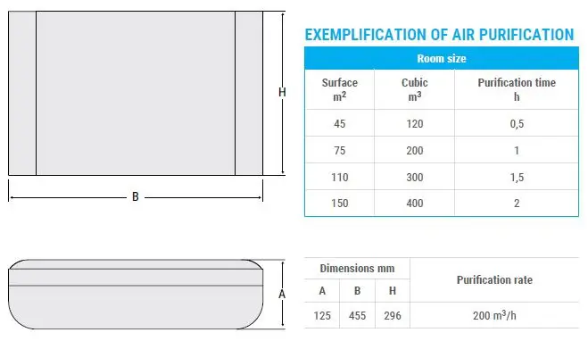 Levegőfertőtlenítő készülék. A szűrő és fertőtlenítő egység egy állítható sebességű axiális ventilátorrendszerből áll, mely az UV-C fényforrást tartalmazó zárt térbe szívja be a levegőt, ahol megtörténik a fertőtlenítés. Egy UvOxy® technológiájú fényforrás helyezkedik el a készülék belsejében, melynek átlagos élettartama 12 hónap.