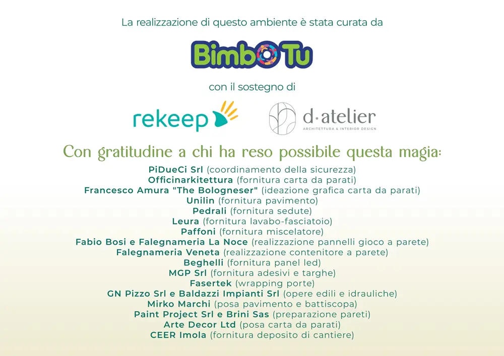«Crediamo che imprese, associazioni e cittadini debbano essere alleati della sanità pubblica per renderla sempre più accogliente e vicina alle persone - ha commentato il Presidente di Rekeep, Claudio Levorato – Abbiamo aderito con entusiasmo a questo progetto di Bimbo Tu, con cui collaboriamo da tempo, perché risponde perfettamente a questa visione. Sostenere la realizzazione della nuova nursery oculistica è per noi un segno concreto di responsabilità sociale d’impresa e riflette la nostra propensione, connessa alla nostra attività nel facility management, a prenderci cura degli spazi e degli ambienti in cui le persone vivono e crescono.»